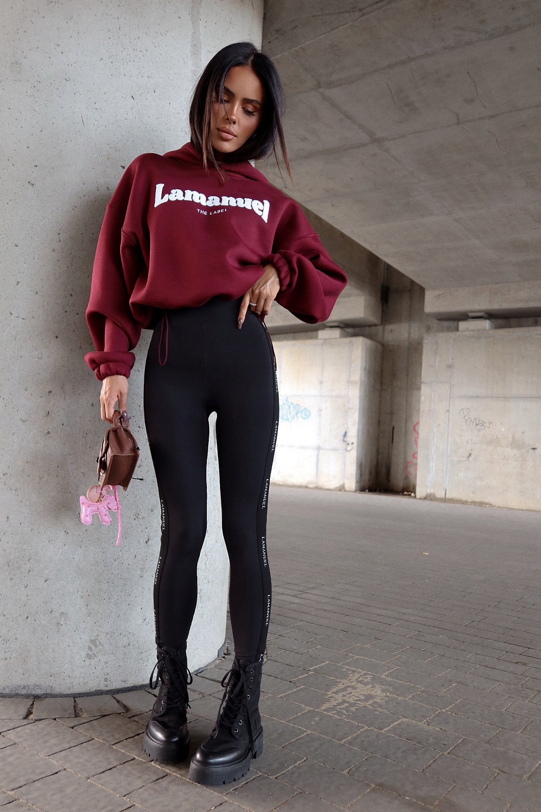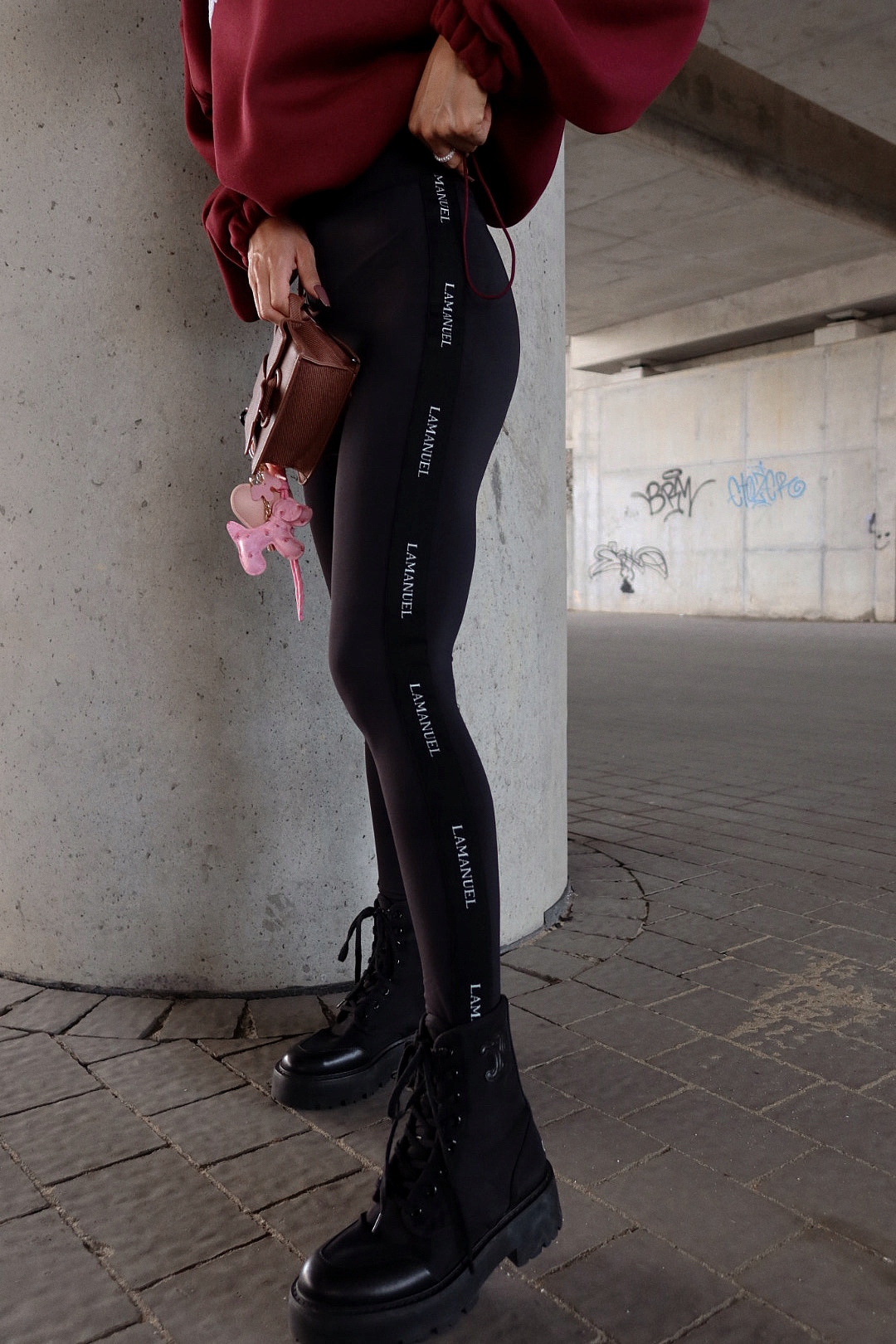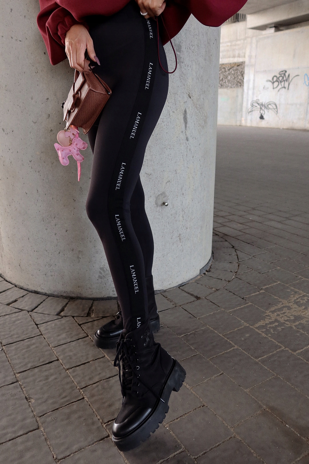 Modelujące legginsy z elastycznej lycry z charakterystyczną logowaną taśmą wzdłuż nogawek. Wysoki stan pięknie podkreśla talię, a mocno dopasowany krój akcentuje sylwetkę. Idealne do sportowych i miejskich stylizacji — noś je do oversize’owych t-shirtów, bluz czy marynarek.