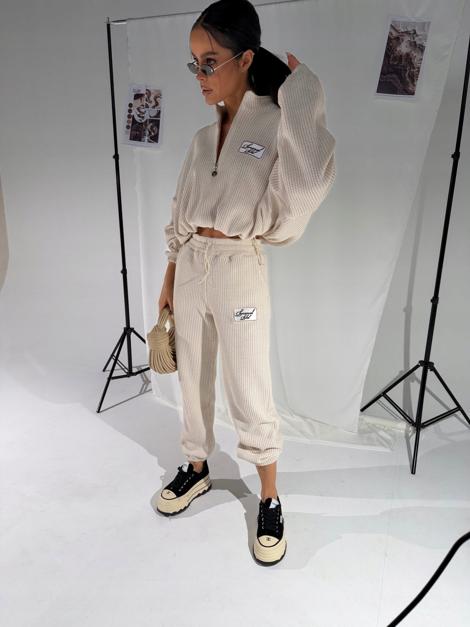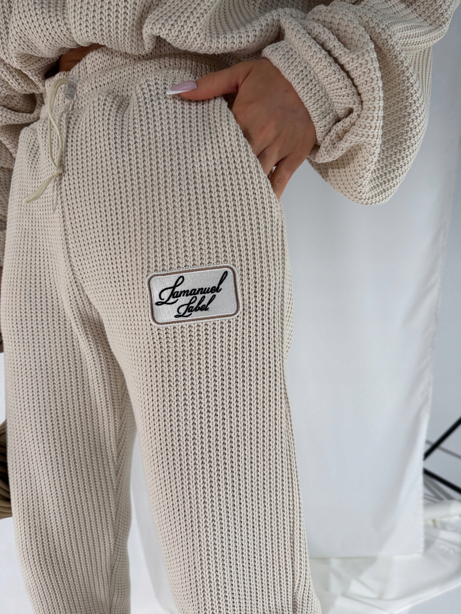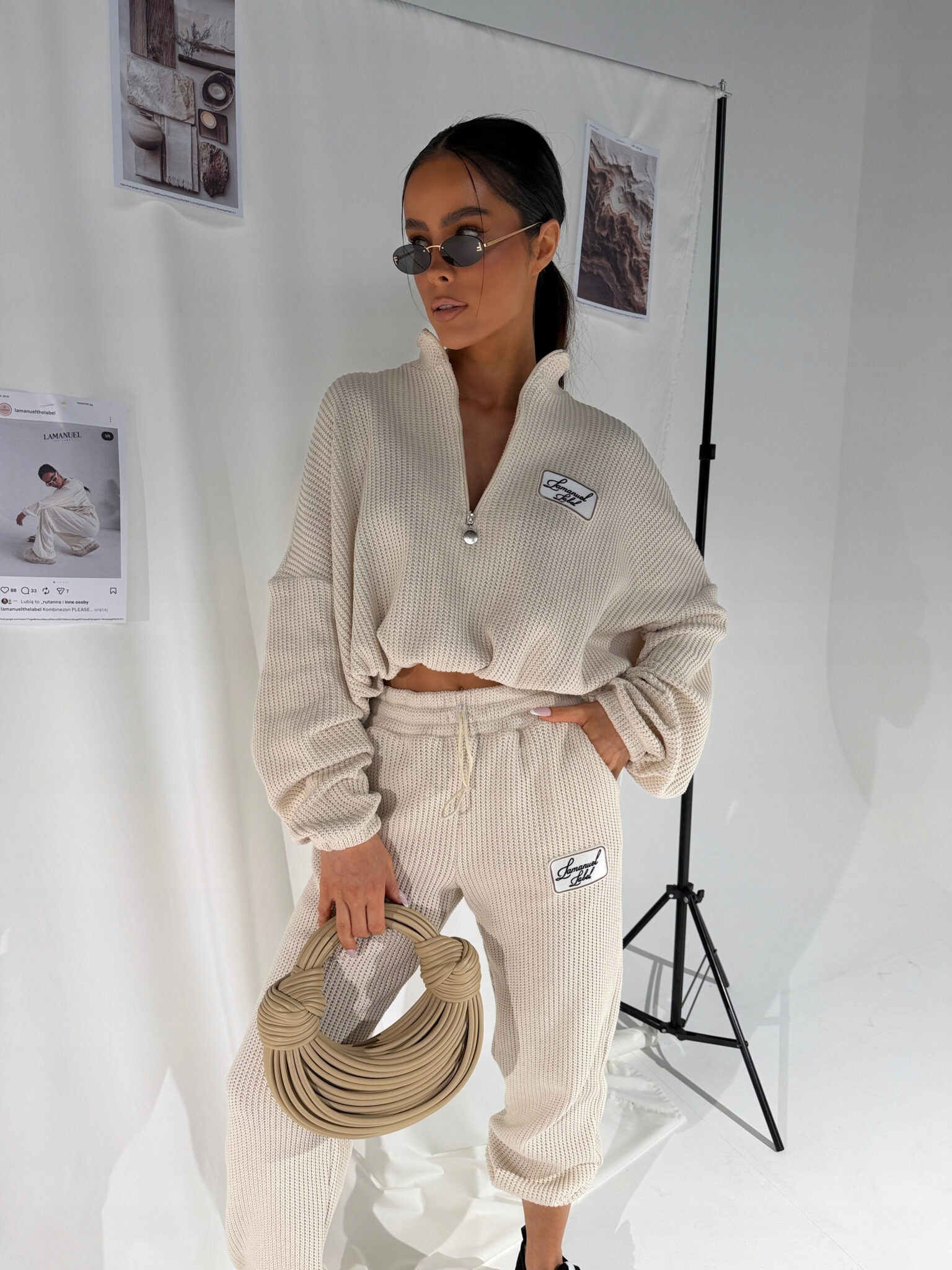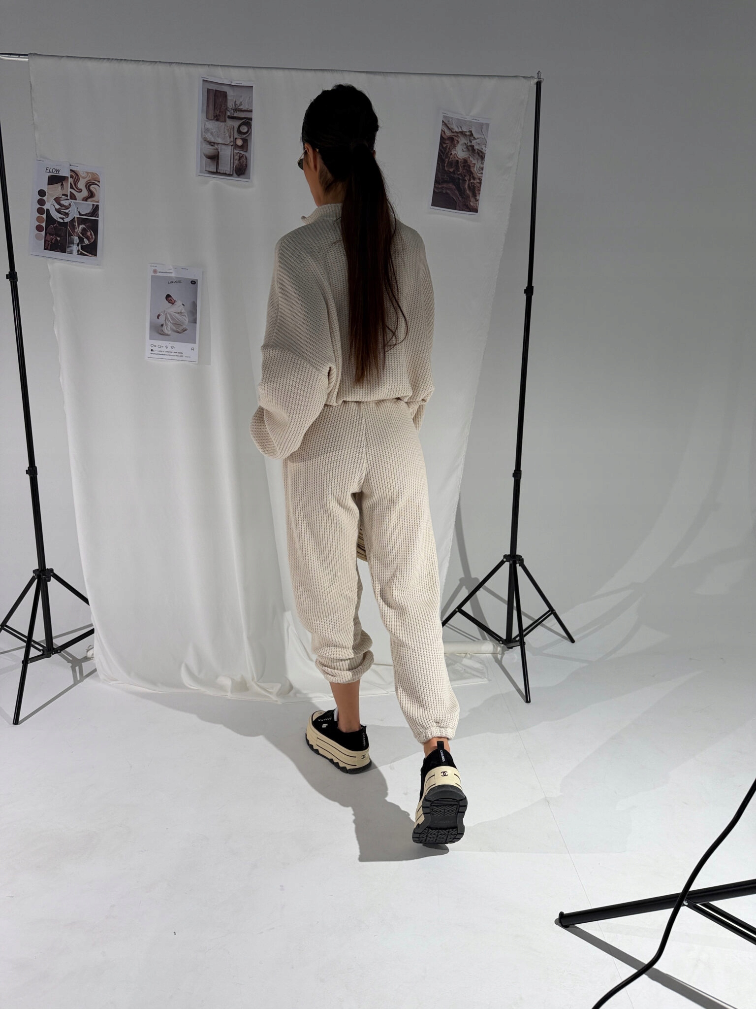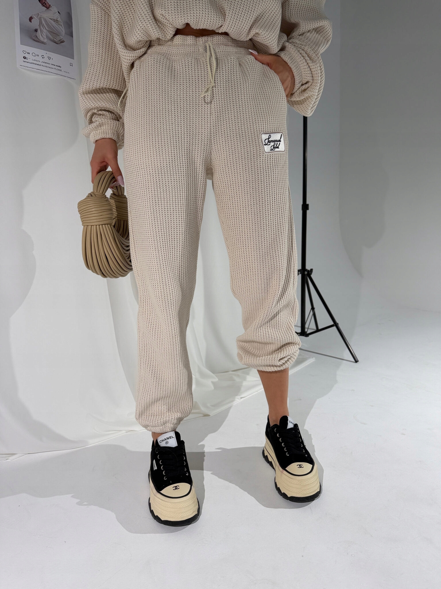 Swobodne spodnie o wyraźnej strukturze, która sama w sobie robi robotę. Mięsisty materiał w grubym splocie przyjemnie otula ciało i dobrze układa się w ruchu. Pas z elastycznym wykończeniem i bawełnianym sznurkiem do regulacji. Nogawka lekko zwężana, z luźnym wykończeniem – nie ma ściągacza, ale materiał naturalnie układa się przy kostce. Naszywka z haftem nadaje całości sportowego charakteru, ale spokojnie można je nosić też w bardziej modowych stylizacjach. Styl na totalnym luzie, ale z przemyślanym detalem.