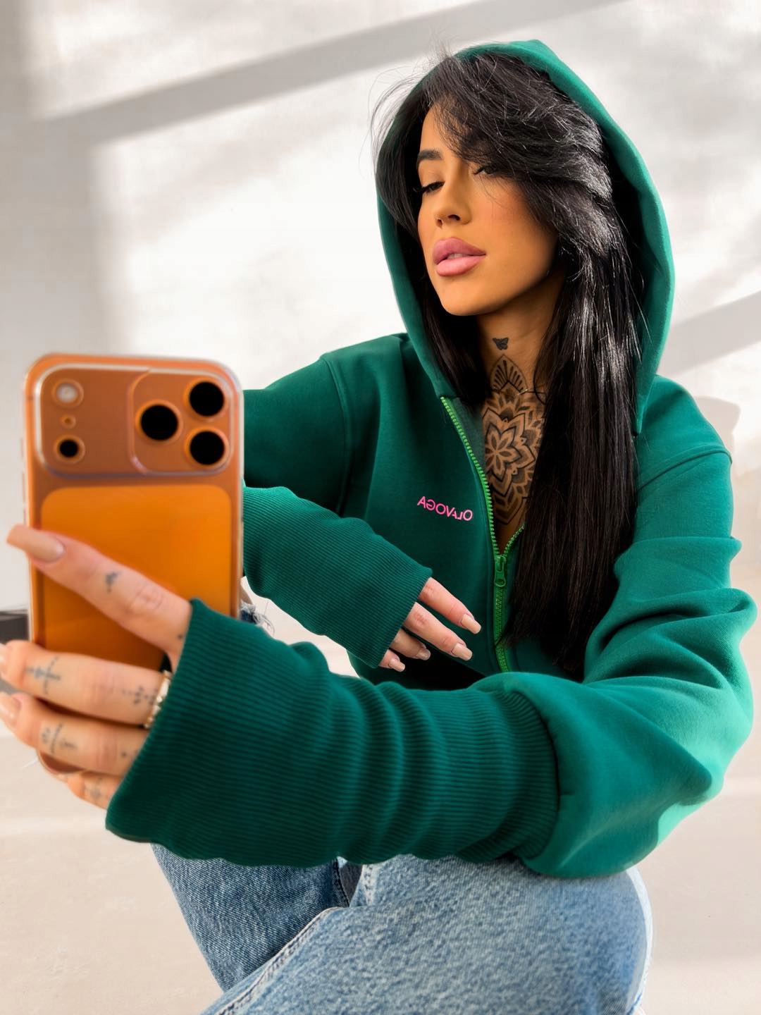 Casualowa bluza wykonana z miękkiej, elastycznej dzianiny o gładkiej, jednolitej strukturze. Model z kapturem, zapinany na suwak, o klasycznym kroju. Bluza z długim rękawem, wykończonym elastycznymi ściągaczami z wycięciem na kciuk. Dół wykończony ściągaczem. Na przodzie subtelne logo marki OLAVOGA w kontrastowym kolorze. Na plecach większy nadruk z logo brandu oraz hasłem Essence of Comfort.