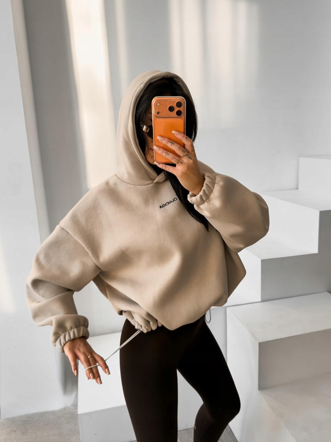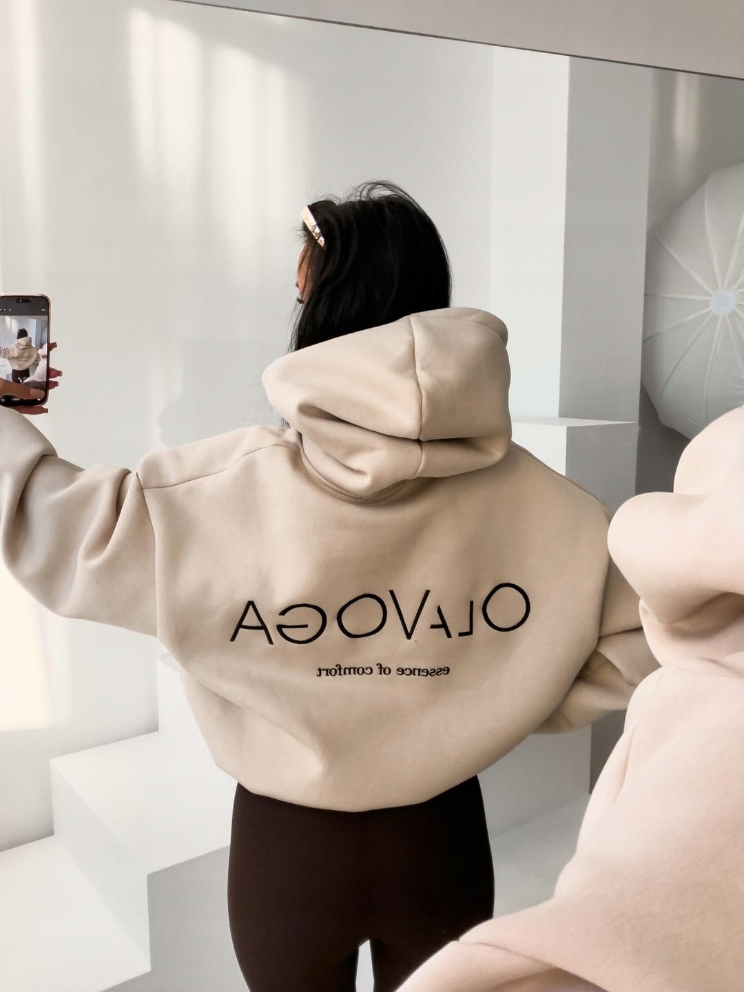 Casualowa bluza wykonana z miękkiej, przyjemnej w dotyku dzianiny o gładkiej, jednolitej strukturze. Model z kapturem o luźniejszym, komfortowym kroju. Bluza z długim rękawem, wykończonym elastycznymi ściągaczami. Dół zakończony delikatnym ściągaczem. Na przodzie haft z minimalistycznym logo marki OLAVOGA. Na plecach większe logo brandu oraz hasło essence of comfort.