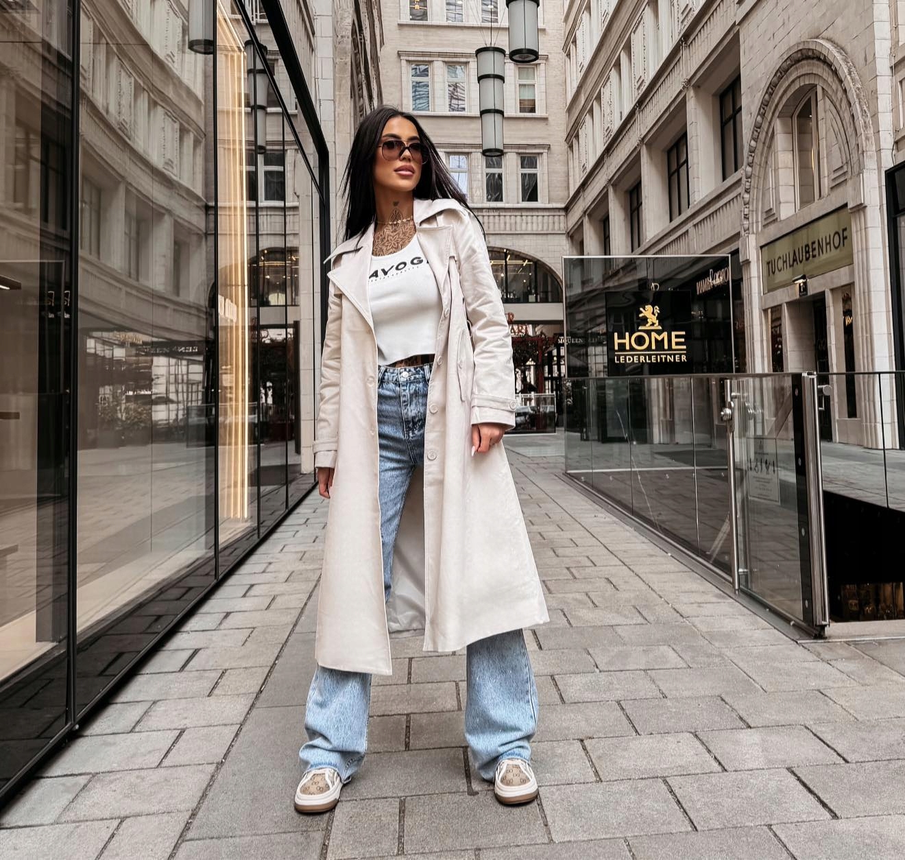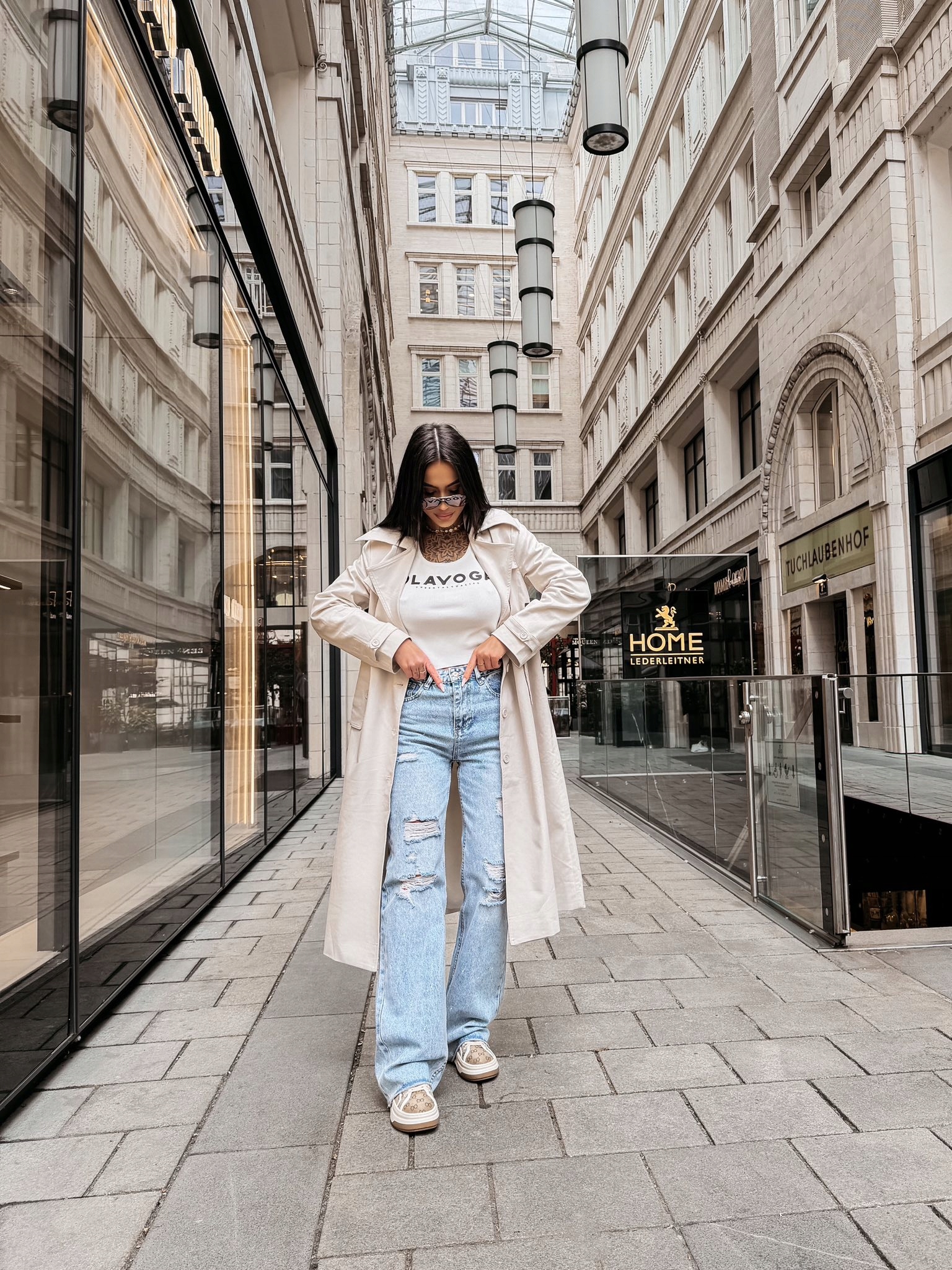 Płaszcz wykonany z gładkiej tkaniny. Klasyczny kołnierz z klapami. Długi rękaw. Zapięcie na guziki. W talii pasek do regulacji i podkreślenia sylwetki. Kieszenie po bokach. Na plecach i rękawie detal z logo.